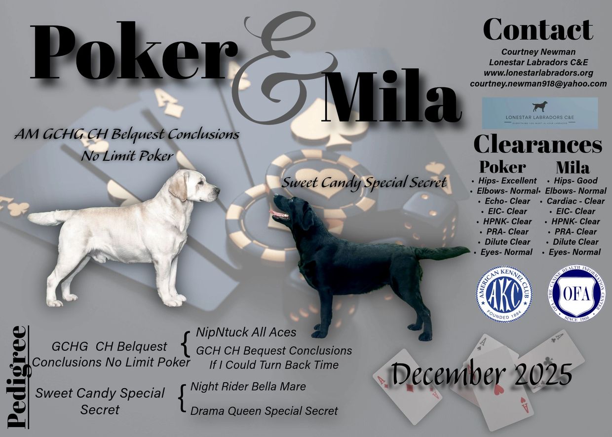 Mila is our Serbian import. She will be bred early October 2025 to AM GCH CH Belquest Conclusions No Limit Poker. This will be a black and yellow litter due in December with a February go home time frame. We have started a waitlist. We want to thank Krista Beal with Belquest Conclusion Labradors for sharing Poker with us!